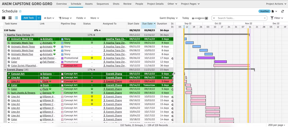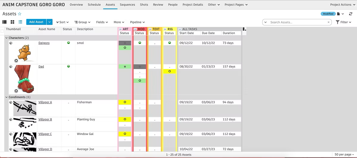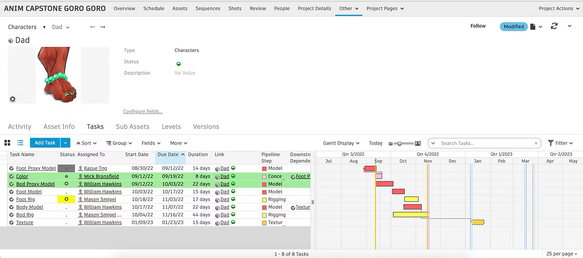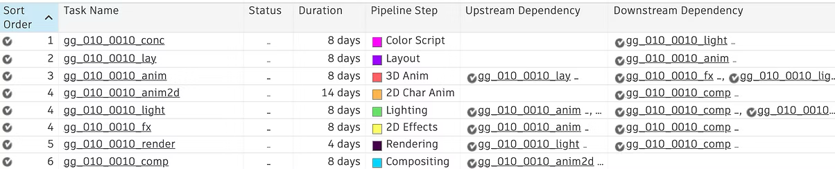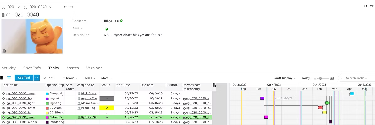 This is what the shot template looks like in action. There is a clear understanding of what quarters certain steps of the pipeline will be complete, and if one due date is pushed, it's downstream dependencies’ start dates will automatically be pushed.