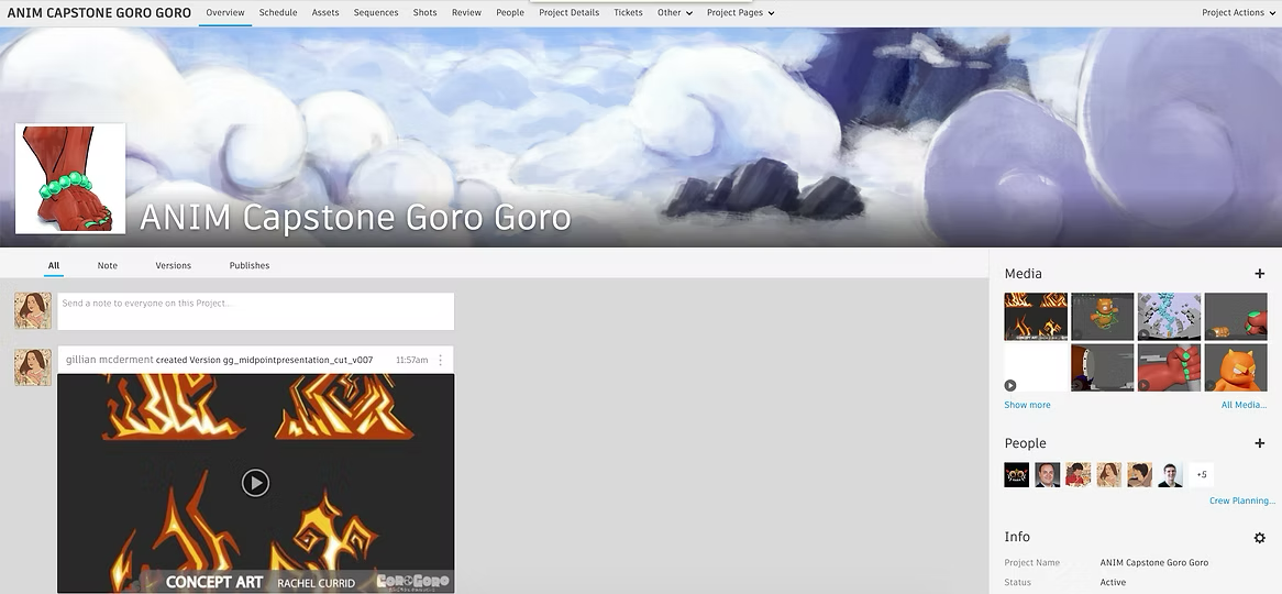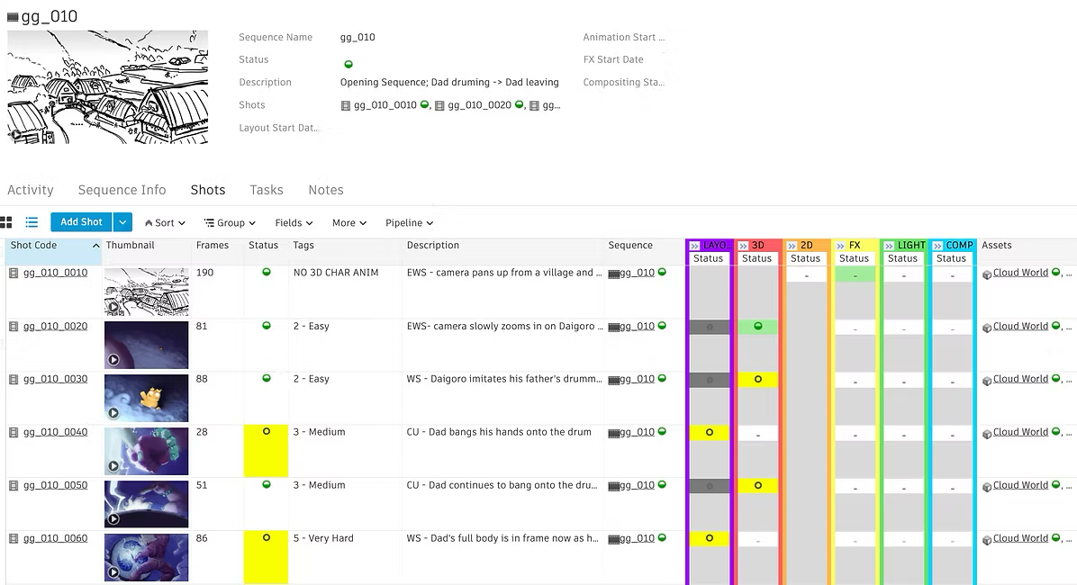 My favorite custom feature of this page is the pipeline step status. This is excellent for quick access to what the statuses are regarding certain shots. Additionally, they are in a rainbow order to make it easier to read.