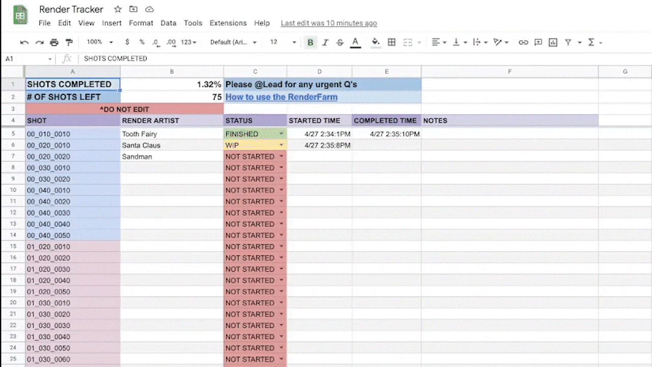 To keep track of what shots were being rendered, who was rendering, and when they began and finished, I created this spreadsheet to keep track of all progress during the day.